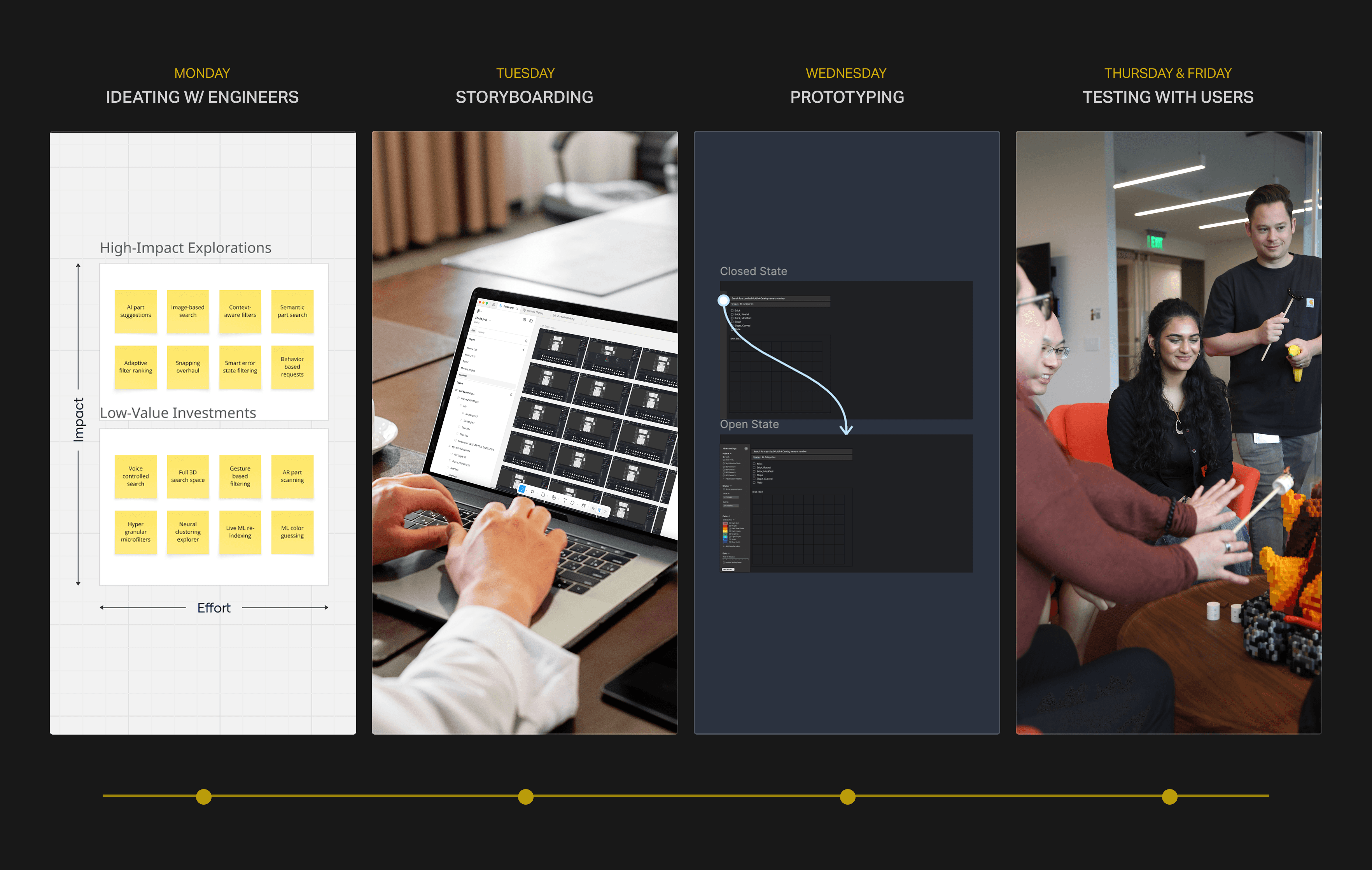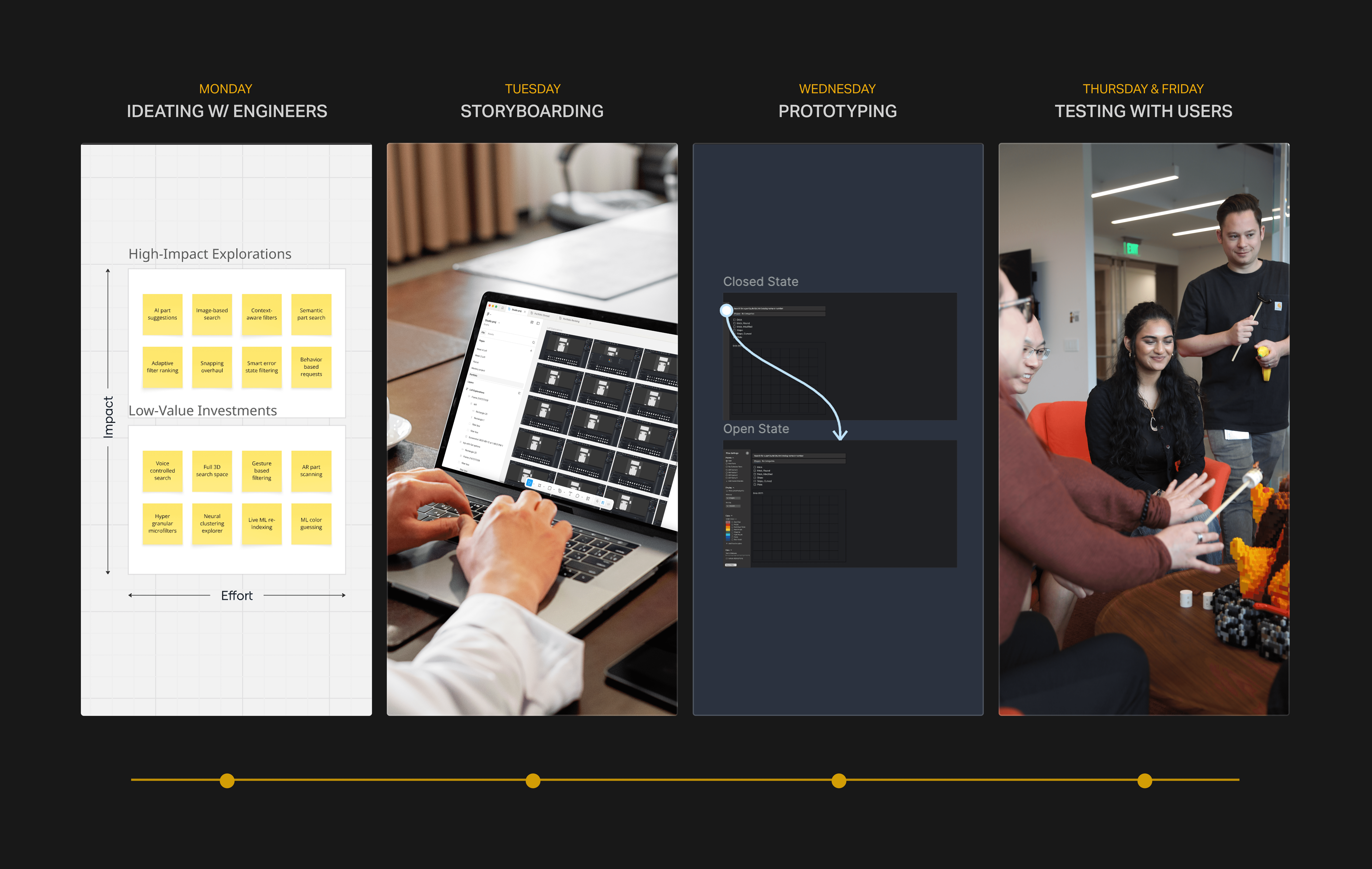 Because this change would significantly impact users, usability testing became central to the process. I would spend Monday ideating with engineers, Tuesday storyboarding, Wednesday creating the prototype, and Thursday/Friday testing.